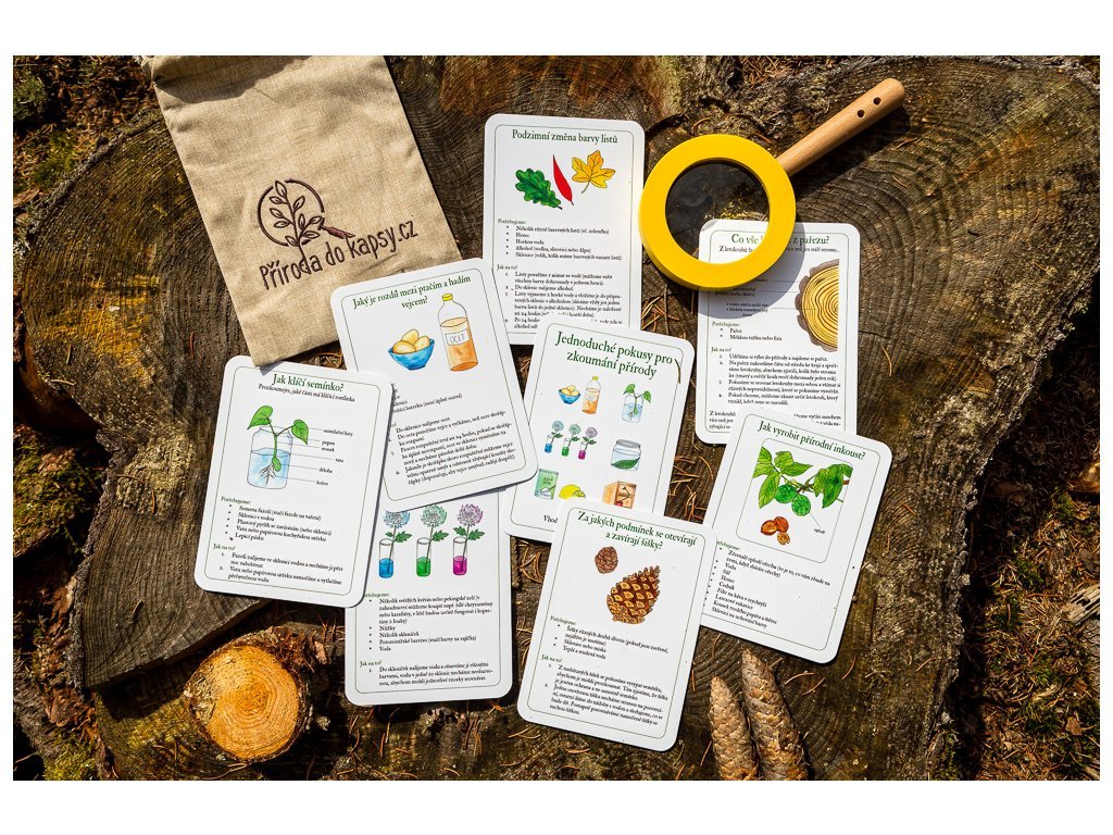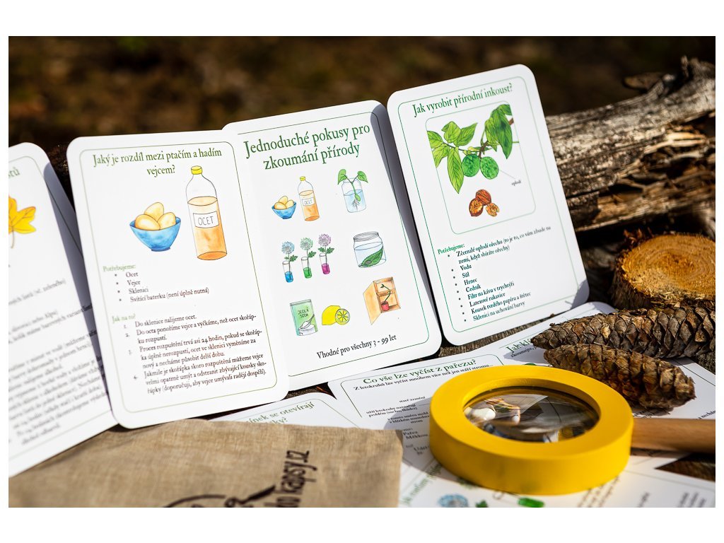 Karty mají velikost 105x148mm, tedy formát A6. Tento formát je dostatečně velký, aby na něm byly patrné všechny důležité detaily. Zároveň je ideálně skladný pro to, aby se karty daly nosit všude s sebou, vejdou se i do toho nejmenšího batůžku, pokud budete chtít experimenty zkoušet venku.